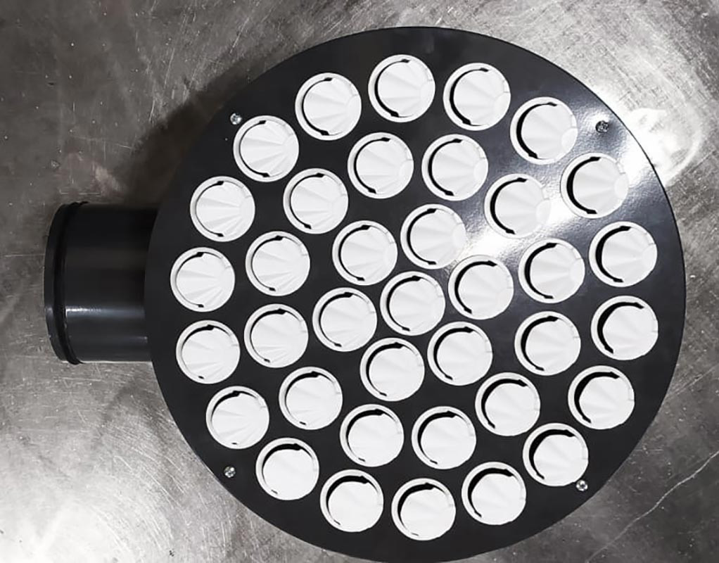 Конструкция воздухораспределителя представляет собой камеру статического давления (КСД) с воздухораздающей панелью круглой формы, в которой установлены поворотные ячейки в виде ракушек. Возможно изготовление воздухораспределителя прямоугольной формы - ВПТ.